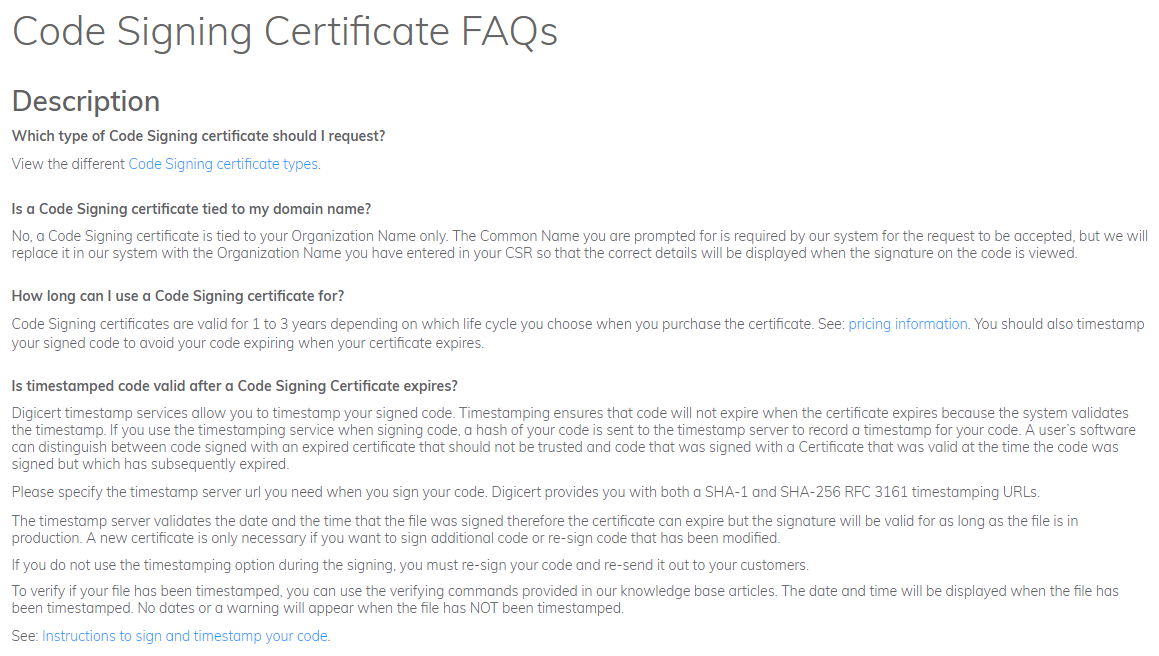 Description Which type of Code Signing certificate should I request? View the different Code Signing certificate types. Is a Code Signing certificate tied to my domain name? No, a Code Signing certificate is tied to your Organization Name only. The Comm