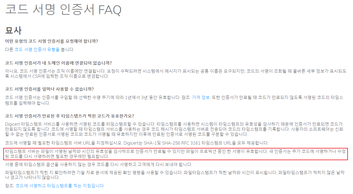 TimeStamp Server를 추가하여 서명하는 경우 Code Signing 인증서가 만료가 되어도 유효한 것으로 표시가 된다.