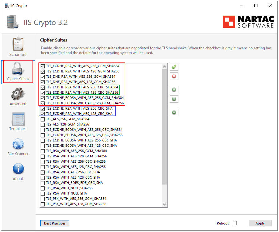 녹색 부분 - TLS 1.2 사용이나 Week 상태의 Cipher Suites 입니다. 하위 브라우저 호환을 위해서 선택,